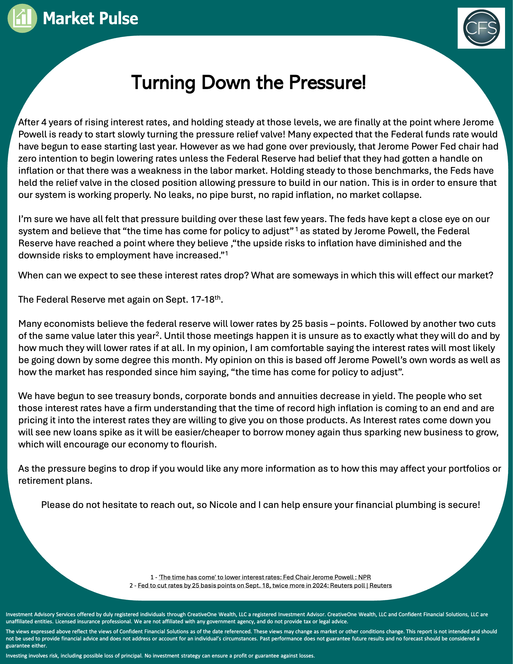 We are a financial services firm helping clients prepare for retirement through the use of insurance and investment products. Investment advisory services are offered by duly registered individuals through CreativeOne Wealth, LLC, a registered investment adviser. CreativeOne Wealth and Confident Financial Solutions are unaffiliated entities. Insurance provided through licensed insurance professionals only.